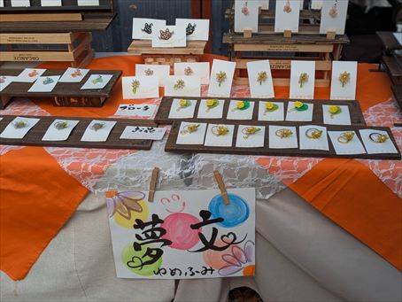 会場ではキッチンカーや近郊のお店の出店もあり、「夢文」さんの手作りブローチが人気を集めています。